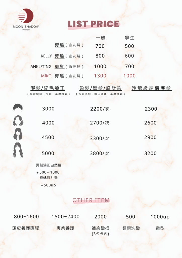 以頭皮專業的諮詢與護理為起點,讓每一位客人了解自己的頭皮狀況。進而透過專業的造型諮詢,從剪、燙、染到護髮,專業呵護你的每一根髮絲,為客戶打造專屬自己最合適的亮麗造型。
